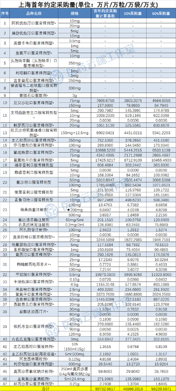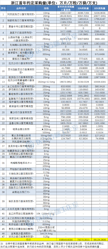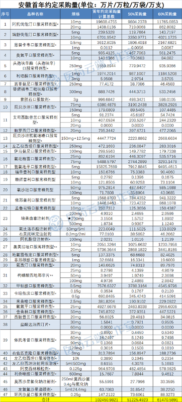 約定采購量:各品種首年約定采購量按以下規則確定:實際中選企業為該地國家集采同品種中選企業的,為首年約定采購量計算基數的60%;抗菌藥物,以及實際中選企業非該地國家集采同品種中選企業的,為首年約定采購量計算基數的50%。各省采購量具體詳見文末附表。